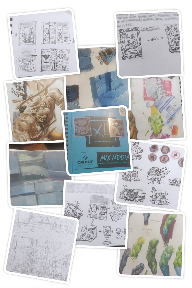 A veces le mando páginas de este sketchbook a amigos cercanos, esperando que me respondan con fotos de los suyos. Hay gente que manda fotos de su pene los sábados. Yo mando fotos... pero de mi cuaderno, lleno de ideas alocadas, bocetos sin terminar y caos — pero todo mío, y todo con valor. Y cuando alguien me manda una página de su cuaderno, se arma ese pequeño momento hermoso de inspiración compartida. No es sexy, pero es creativo. Y a veces, eso alcanza.